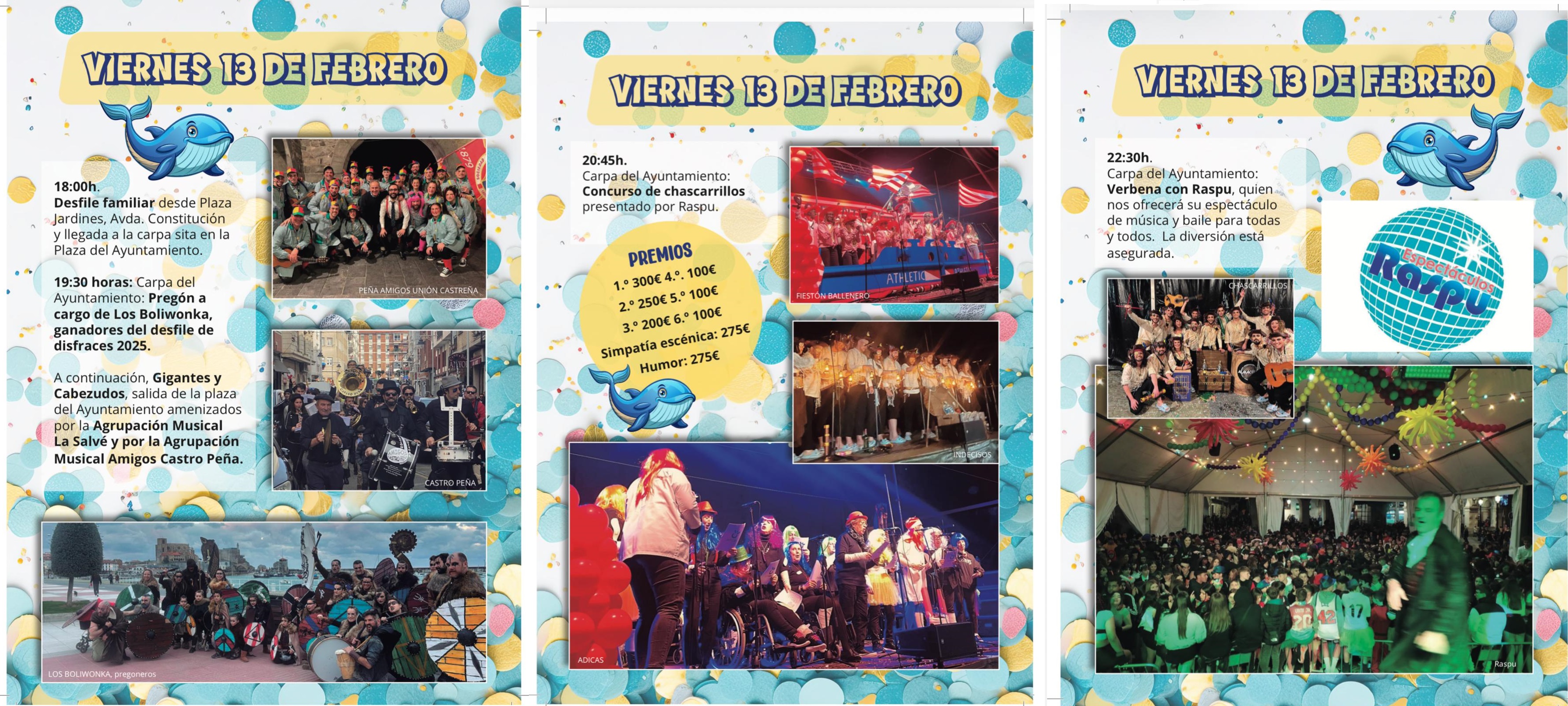 • El grupo carnavalesco BOLIWONKA será el encargado de ejercer como pregonero mayor en esta edición. Tras el pregón, las calles se animarán con la salida de Gigantes y Cabezudos, acompañados por Amigos Castro Peña y La Salve.