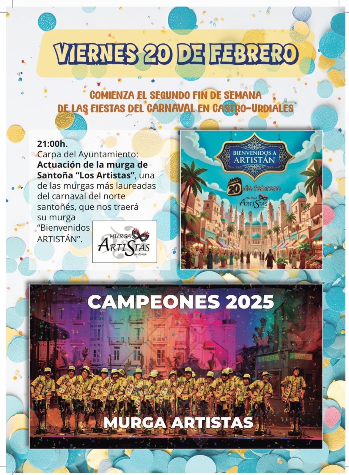 • El viernes 20 de febrero tendrá lugar la actuación de la murga Los Artistas, que ofrecerán su espectáculo “Bienvenidos a Artistan” en la carpa del Ayuntamiento.