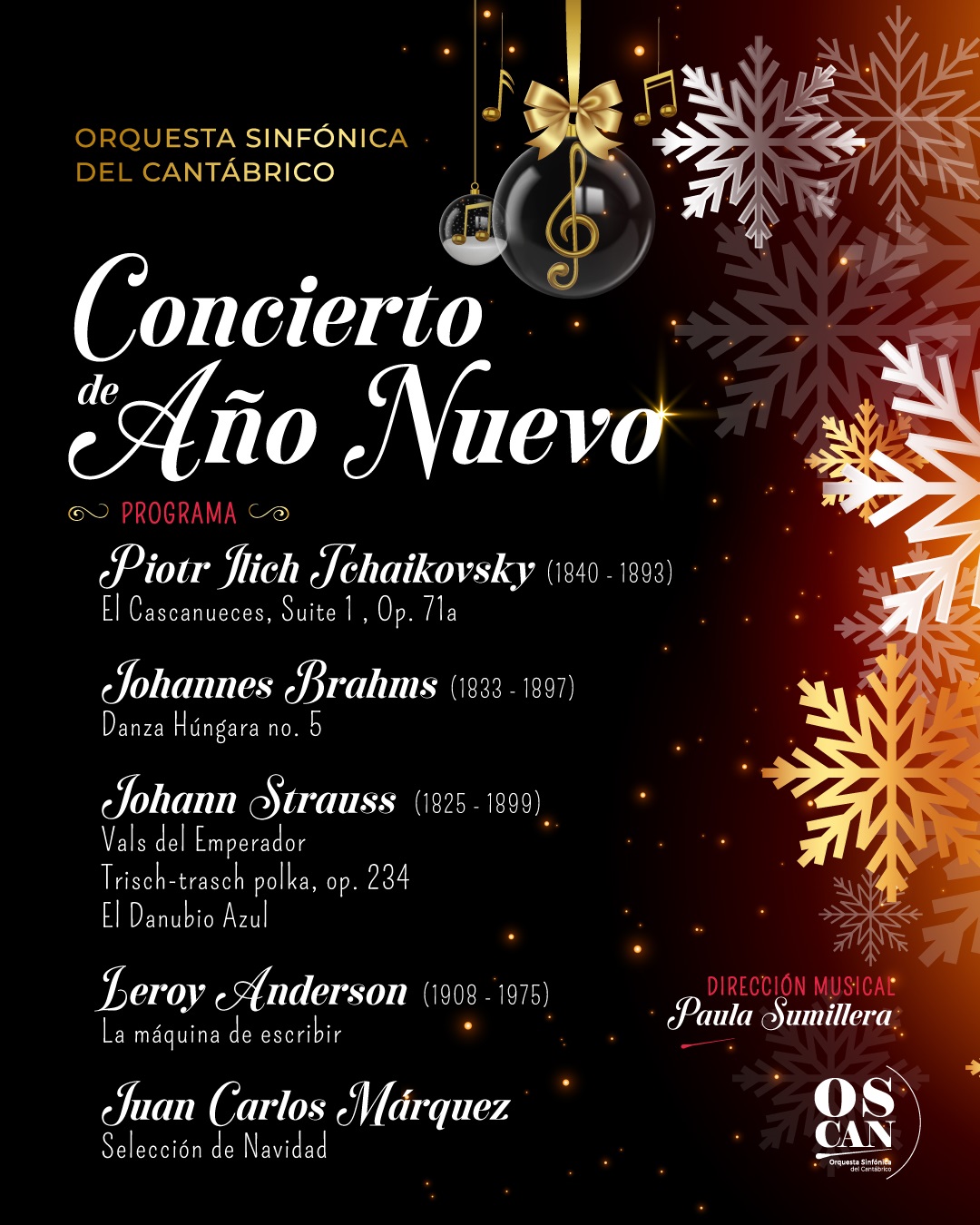 Junto a estas obras, la OSCAN interpretará la "Danza Húngara número 5" de Johannes Brahms, inspirada en melodías populares centroeuropeas, así como La máquina de escribir, de Leroy Anderson, una partitura de marcado carácter lúdico que introduce un componente rítmico y escénico fácilmente reconocible por el público.